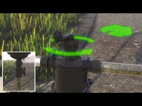 presión indique que el filtro está sucio, se realizarà un ciclo de lavado abriendo la válvula de drenaje y a continuación girando la manija de operación. La apertura de la válvula de drenaje crearà presión baja en las boquillas de succión y la suciedad serà succionada desde la malla hacia las boquillas. La rotación de la manija de operación activarà el movimiento de las boquillas de succión por toda el área de la malla eliminando toda suciedad acumulada en ella. Los residuos se lavaran por el puerto de drenaje botandolos del filtro. Durante el ciclo de lavado, el flujo de agua hacia el campo es constante. Los filtros están disponibles en 2” y 3” para caudales de hasta 50 m3/h (220 gpm).